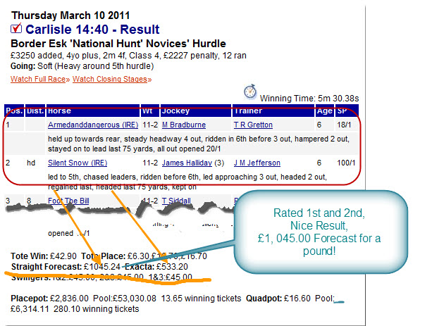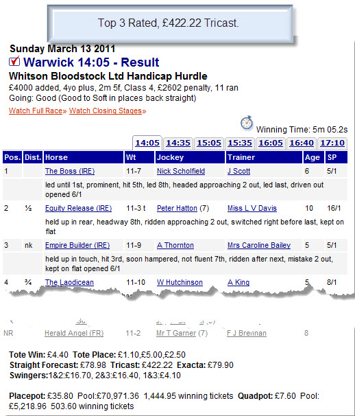 Using the TOP TWO selections.. Here are the Winners.We are not updating individual Winners as from 31st March. 30th Mar, 2011, Ballarina 10.10, Speedy Directa 5.56, Kiama Bay 4.10, E Street Boy 1.91, Another Wise Kid 7.77, Bertenbar2.52, Choral 1.33, Real Milan 9.29, Misty Morn 20.50, Dijarvo 5.50 29th Mar, 2011,Bold Addition 1.21, Ashva 1.84, The Big Haerth 4.20, Qozak 1.15, Baileys Agincourt 5.60, Dickie Le Davoir 8.96, Kingscroft 2.04, Drumbeater 7.69, Ana Emarati 2.54, Dansilver 3.90,Thunder Child 2.54, 28th Mar, 2011, Curragh Dancer 10.00, Wiqaaya 1.09, Sircozy 1.22, Araldur 1.33, Fleetwoodsands 6.40, De Welsh Wizzard 3.11, She's Humble 5.84, Joe Le Taxi 2.06, Lonesome Boatman 4.20,Bach To Front 13.50, Make A Track 2.74 27th Mar, 2011,Flinty Bay 1.65, Midnight Opera 5.70, January 6.01, Final Veto 4.32, Paint The Clouds 1.76, Eyre Square 2.83, Goring One 2.98, Boston Bob 1.72, Bygones Sovereign 3.90 26th Mar, 2011,Anne of Kiev 9.20, Chrysander 2.04, Hes Our Lad 8.40, Bear's Affair 1.68, Sun Tzu 3.73, Nideeb 3.33, Rey Nacarado 5.20, Katmai River 3.20, Musawama 2.56, Pouvoir 6.60,Iver Bridge Lad 3.05, Beaubrav 4.27, Robertewenutter 2.62, Penelope Pips 2.38 25th Mar, 2011, Dorothy's Dancing 1.42, Lucky Meadows 5.67, Hinton Admiral 2.74, Turko 2.47,Fanditha 3.40, Accumulate 2.38, Baby Strange 10.50, 24th Mar, 2011, Sara's Smile 7.40, Lady Bluesky 2.42, Double The Trouble 2.67, The Knoxs 1.67, Roudoudou Ville 2.44, You Know Yourself 4.80, Abstract Art 3.04, Gilwen Glory 9.05, Ballycarron Lad 3.09, Oca De Thaix 2.62, Kingaroo 6.43, Kadouchski 3.55 23rd Mar, 2011,Red Merlin 1.45, Sweet Irony 2.36, Highway Code 2.39, Mister Chancer 2.06, Arnold Layne 4.01, Gentleman Anshan 5.01, A Bridge Too Far 1.42, My Way de Solzen 6.20, Sweet Origin 2.10, Eastern Gift 8.20 22nd Mar, 2011, Shuil Royale 2.74, Take Your Partner 3.50, Lordsbridge4.86, Laustra Bad4.12, Basford Bob 2.90, Beau Fighter 1.99, Pere Blanc 5.69, Rare Symphony 2.58 Trifecta won at £623.00 with our top 3 rated. 21st Mar, 2011,Rossini's Dancer 6.00, Hildisvini 1.96, King Mak 9.4, Goring One 4.5, Tartan Snow 8.4, Mut'ab 3.87, Sole Agent 56.00, Quotica De Poyans 2.36, Collect Art 10.92, Straboe 3.46 trifecta won at £262.40 with our top 3 rated. 20th Mar, 2011, Midnight Appeal 2.73, Rith Bob 3.65, Alvarado 2.53, Fin Vin de Leu 2.92, Rawaaj 4.00, Over The Phone 1.67 19th Mar, 2011, Frequency 3.95, Best Prospect 3.05, Prince Tam 3.41, She Ain't A Saint 2.09, Copper's Gold 2.59, Ambion Wood 4.80, Nomadic Warrior 6.09, Mister Pete 3.05, Dickie Le Davoir 8.80, Copperwood 6.80, Bountiful Guest 4.40 18th Mar, 2011, Edgeworth 2.38, Sole Bonne Femme 8.40, Silly Billy 2.52, Cottage Flyer 4.60, Enigma Variations 4.77, Fujin Dancer 9.61, Apache Glory 5.81, Bestwecan 1.72, Grey Boy 7.40, Barbirolli 17.32 17th Mar, 2011 Noble Prince 5.37, Rupert Lamb 1.96, Holmwood Legend 39.81, Devils Bit 3.55, King's Light 25.00, Delightfully 2.84, Soul Angel 3.94, Go Maggie Go 3.04, Saint Helena 4.27, John Potts 4.33 16th Mar, 2011 Burnthill 4.81, Sofias Number One 1.55, Emmaslegend 2.20, Lewyn 3.30,Twin Soul 2.63, Pelmanism 3.67 15th Mar, 2011 , Streamtown 1.46, Captain Chris 7.27, Finlay 3.55 14th Mar, 2011 , Turtlethomas 48.00, Palawi 1.34, Balerina 1.81, Fiftyonefiftyone 3.42, Thunder Child 3.81, Little Roxy 3.55, Present A Star 5.36, Cork All Star 1.36 13th Mar, 2011 , The Boss 6.84, Evella 1.70, Wistow 2.00, Ballybriggan 1.48, Ouest Eclair 14.31 2:05 Warwick, WON tricast £422.22 with our top 3 rated. 12th Mar, 2011.Trucking Along 12, Rebel Swing 5.16, Raysrock 2.21, Form And Beauty 6.16, Swincombe Flame 10.37, Mamlook 5.19, Holmwood Legend 19.01, Lowther 6.57,Go Maggie Go 8.58, Admirable Duque 21.88 11th Mar, 2011, Violin Davis 4.79, Whispering Jack 2.42, Bold Addition 1.71, Shinko Moon 8.17,Cool Mission 1.72 , Shooting Times 13.50, Innominate 2.93, Swansbrook 1.41, Takeroc 1.98,Owner Occupier 4.48, Blu Teen 5.70, Alfraamsey 6.00, Jawaab 10.16, Gottany O's 1.63, Erinjay 1.43, Rosewood Lad 6.88 17 winners out of 32 races 10th Mar, 2011, Alexander Road 5.50, Baile Anrai 1.61, Armedanddangerous24.00,Neil Harvey 3.53, Renard D'irlande 1.55, Midnight Appeal 2.90, Management 2.76 Forecast Top 2 Pays £1,045.00 9th Mar, 2011, Where's Susie 4.80, Gurtacrue 2.18, Bardolet 3.80, I Can Run Can You 3.35, Delgany Gunner 9.20, Brilliant Barca 3.20, Jake The Snake 2.84, Sir Boss 6.48 8th Mar, 2011, Where's Reiley 5.19, Jukebox Melody 3.50, La Estrella 1.34, Cute N You Know It 5.70, Lockstown 3.55, Irish Jugger 2.60, Willie Hall 2.96, Tiptoeaway 1.81, Trans Sonic 5.40, Categorical 6.60 10 winners out of 21 races 7th Mar, 2011, Alla Svelta 2.17, Lastkingofscotland 7.11, Rileyev 2.08, Eternal Youth 3.96, Milo Milan 4.51, Quartz de Thaix 4.50, Twin Soul 2.39, Mickmacmagoole 7.20, Themilanhorse 2.56 6th Mar, 2011,Cloudy Too 8.40, 5th Mar, 2011, Polar Gunner 22.00, Medinas 13.99, Regal Heights 6.60, Tuskar Rock 9.20, Araldur 3.76, Drive Time 5.30, Always Right 6.49, Pokfulham 5.48, Quotica De Poyans 2.46 4th Mar, 2011, Govenor General 6.19, Jacobs Son 1.51, Flynn's Boy 7.01, Eastern Gift 4.11,Estonia 3.09, Baseball Ted 7.20, Better Self 3.19, School For Scandal 1.27 3rd Mar, 2011,Havingotascoobydo 3.59, Isn't That Lucky 5.00, Whispering Jack 5.71, The General Lee 10.50, One Pursuit 1.83, Fantasy Fry 2.45, Cobo Bay 3.18, Henry King 4.80, Ridgeway Hawk 12.48, Apache Ridge 10.02, Hill Tribe 3.55, Nevada Desert 9.60, John Potts 3.40, Desert Shine 1.48,Stoneacre Gareth 1.77 15 winners out of 29 races 2nd Mar, 2011, Miereveld 3.28, Numide 5.95, Pie At Midnight 3.47, Non Dom 3.44, Jackson Cage 2.21, Super Directa 2.42, Victrix Gale 5.40, Rince Donn 4.40, Victory Gunner 3.65, Arbeo 1.48, Grey Boy 4.06, Blue Cossack 4.06, Avonrose 6.67, Covert Decree 1.33, Kidlat 2.68, Al Aqabah 4.45 1st Mar, 2011, Timesawastin 2.06, Border Lad 2.53, Patman Du Charmil 4.67, Marias Rock 5.07,Sertao 2.61, Galaxy Rock 1.34, Over The Phone 2.2, Ours 2.02, Jack's Revenge 3.00, A Little Bit Dusty 2.27, Kahfre