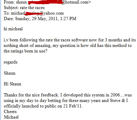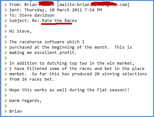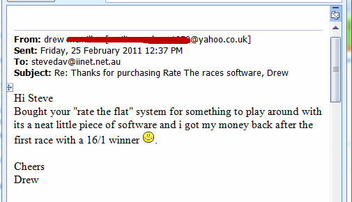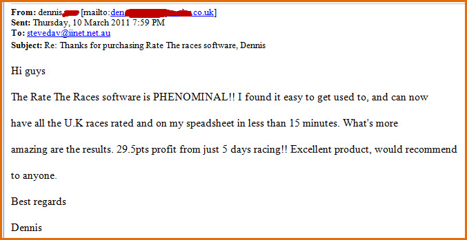 If you don't accept this offer where will you be with your punting in a month from now? 2011-25© www.rate-the-races.com Steve Davidson © 2011-25 Refund Policy We, as a merchant, provide both products (goods) and services (information) to our customers. If merchandise or products are ordered through a Direct Mail advertisement or via the Internet, the guarantee, if any, is included in the mailing, promotion or service description. Our advertising will also include the terms and conditions for refunds on any books, publications and/or systems purchased. |
