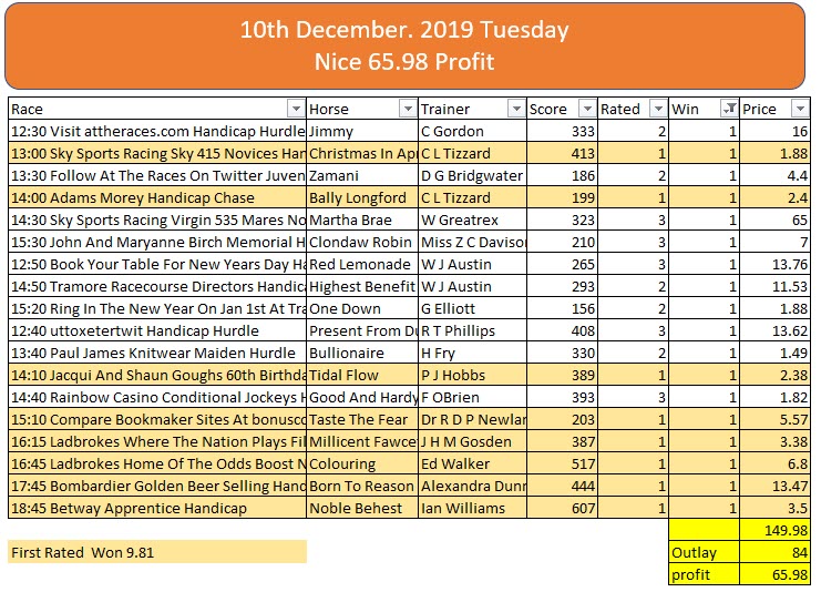 Using the TOP TWO selections.. Here are the Winners.We are not updating individual Winners as from 31st March. 30th Mar, 2011, Ballarina 10.10, Speedy Directa 5.56, Kiama Bay 4.10, E Street Boy 1.91, Another Wise Kid 7.77, Bertenbar2.52, Choral 1.33, Real Milan 9.29, Misty Morn 20.50, Dijarvo 5.50 29th Mar, 2011,Bold Addition 1.21, Ashva 1.84, The Big Haerth 4.20, Qozak 1.15, Baileys Agincourt 5.60, Dickie Le Davoir 8.96, Kingscroft 2.04, Drumbeater 7.69, Ana Emarati 2.54, Dansilver 3.90,Thunder Child 2.54, 28th Mar, 2011, Curragh Dancer 10.00, Wiqaaya 1.09, Sircozy 1.22, Araldur 1.33, Fleetwoodsands 6.40, De Welsh Wizzard 3.11, She's Humble 5.84, Joe Le Taxi 2.06, Lonesome Boatman 4.20,Bach To Front 13.50, Make A Track 2.74 27th Mar, 2011,Flinty Bay 1.65, Midnight Opera 5.70, January 6.01, Final Veto 4.32, Paint The Clouds 1.76, Eyre Square 2.83, Goring One 2.98, Boston Bob 1.72, Bygones Sovereign 3.90 26th Mar, 2011,Anne of Kiev 9.20, Chrysander 2.04, Hes Our Lad 8.40, Bear's Affair 1.68, Sun Tzu 3.73, Nideeb 3.33, Rey Nacarado 5.20, Katmai River 3.20, Musawama 2.56, Pouvoir 6.60,Iver Bridge Lad 3.05, Beaubrav 4.27, Robertewenutter 2.62, Penelope Pips 2.38 25th Mar, 2011, Dorothy's Dancing 1.42, Lucky Meadows 5.67, Hinton Admiral 2.74, Turko 2.47,Fanditha 3.40, Accumulate 2.38, Baby Strange 10.50, 24th Mar, 2011, Sara's Smile 7.40, Lady Bluesky 2.42, Double The Trouble 2.67, The Knoxs 1.67, Roudoudou Ville 2.44, You Know Yourself 4.80, Abstract Art 3.04, Gilwen Glory 9.05, Ballycarron Lad 3.09, Oca De Thaix 2.62, Kingaroo 6.43, Kadouchski 3.55 23rd Mar, 2011,Red Merlin 1.45, Sweet Irony 2.36, Highway Code 2.39, Mister Chancer 2.06, Arnold Layne 4.01, Gentleman Anshan 5.01, A Bridge Too Far 1.42, My Way de Solzen 6.20, Sweet Origin 2.10, Eastern Gift 8.20 22nd Mar, 2011, Shuil Royale 2.74, Take Your Partner 3.50, Lordsbridge4.86, Laustra Bad4.12, Basford Bob 2.90, Beau Fighter 1.99, Pere Blanc 5.69, Rare Symphony 2.58 Trifecta won at £623.00 with our top 3 rated. 21st Mar, 2011,Rossini's Dancer 6.00, Hildisvini 1.96, King Mak 9.4, Goring One 4.5, Tartan Snow 8.4, Mut'ab 3.87, Sole Agent 56.00, Quotica De Poyans 2.36, Collect Art 10.92, Straboe 3.46 trifecta won at £262.40 with our top 3 rated. 20th Mar, 2011, Midnight Appeal 2.73, Rith Bob 3.65, Alvarado 2.53, Fin Vin de Leu 2.92, Rawaaj 4.00, Over The Phone 1.67 19th Mar, 2011, Frequency 3.95, Best Prospect 3.05, Prince Tam 3.41, She Ain't A Saint 2.09, Copper's Gold 2.59, Ambion Wood 4.80, Nomadic Warrior 6.09, Mister Pete 3.05, Dickie Le Davoir 8.80, Copperwood 6.80, Bountiful Guest 4.40 18th Mar, 2011, Edgeworth 2.38, Sole Bonne Femme 8.40, Silly Billy 2.52, Cottage Flyer 4.60, Enigma Variations 4.77, Fujin Dancer 9.61, Apache Glory 5.81, Bestwecan 1.72, Grey Boy 7.40, Barbirolli 17.32 17th Mar, 2011 Noble Prince 5.37, Rupert Lamb 1.96, Holmwood Legend 39.81, Devils Bit 3.55, King's Light 25.00, Delightfully 2.84, Soul Angel 3.94, Go Maggie Go 3.04, Saint Helena 4.27, John Potts 4.33 16th Mar, 2011 Burnthill 4.81, Sofias Number One 1.55, Emmaslegend 2.20, Lewyn 3.30,Twin Soul 2.63, Pelmanism 3.67 15th Mar, 2011 , Streamtown 1.46, Captain Chris 7.27, Finlay 3.55 14th Mar, 2011 , Turtlethomas 48.00, Palawi 1.34, Balerina 1.81, Fiftyonefiftyone 3.42, Thunder Child 3.81, Little Roxy 3.55, Present A Star 5.36, Cork All Star 1.36 13th Mar, 2011 , The Boss 6.84, Evella 1.70, Wistow 2.00, Ballybriggan 1.48, Ouest Eclair 14.31 2:05 Warwick, WON tricast £422.22 with our top 3 rated. 12th Mar, 2011.Trucking Along 12, Rebel Swing 5.16, Raysrock 2.21, Form And Beauty 6.16, Swincombe Flame 10.37, Mamlook 5.19, Holmwood Legend 19.01, Lowther 6.57,Go Maggie Go 8.58, Admirable Duque 21.88 11th Mar, 2011, Violin Davis 4.79, Whispering Jack 2.42, Bold Addition 1.71, Shinko Moon 8.17,Cool Mission 1.72 , Shooting Times 13.50, Innominate 2.93, Swansbrook 1.41, Takeroc 1.98,Owner Occupier 4.48, Blu Teen 5.70, Alfraamsey 6.00, Jawaab 10.16, Gottany O's 1.63, Erinjay 1.43, Rosewood Lad 6.88 17 winners out of 32 races 10th Mar, 2011, Alexander Road 5.50, Baile Anrai 1.61, Armedanddangerous24.00,Neil Harvey 3.53, Renard D'irlande 1.55, Midnight Appeal 2.90, Management 2.76 Forecast Top 2 Pays £1,045.00 9th Mar, 2011, Where's Susie 4.80, Gurtacrue 2.18, Bardolet 3.80, I Can Run Can You 3.35, Delgany Gunner 9.20, Brilliant Barca 3.20, Jake The Snake 2.84, Sir Boss 6.48 8th Mar, 2011, Where's Reiley 5.19, Jukebox Melody 3.50, La Estrella 1.34, Cute N You Know It 5.70, Lockstown 3.55, Irish Jugger 2.60, Willie Hall 2.96, Tiptoeaway 1.81, Trans Sonic 5.40, Categorical 6.60 10 winners out of 21 races 7th Mar, 2011, Alla Svelta 2.17, Lastkingofscotland 7.11, Rileyev 2.08, Eternal Youth 3.96, Milo Milan 4.51, Quartz de Thaix 4.50, Twin Soul 2.39, Mickmacmagoole 7.20, Themilanhorse 2.56 6th Mar, 2011,Cloudy Too 8.40, 5th Mar, 2011, Polar Gunner 22.00, Medinas 13.99, Regal Heights 6.60, Tuskar Rock 9.20, Araldur 3.76, Drive Time 5.30, Always Right 6.49, Pokfulham 5.48, Quotica De Poyans 2.46 4th Mar, 2011, Govenor General 6.19, Jacobs Son 1.51, Flynn's Boy 7.01, Eastern Gift 4.11,Estonia 3.09, Baseball Ted 7.20, Better Self 3.19, School For Scandal 1.27 3rd Mar, 2011,Havingotascoobydo 3.59, Isn't That Lucky 5.00, Whispering Jack 5.71, The General Lee 10.50, One Pursuit 1.83, Fantasy Fry 2.45, Cobo Bay 3.18, Henry King 4.80, Ridgeway Hawk 12.48, Apache Ridge 10.02, Hill Tribe 3.55, Nevada Desert 9.60, John Potts 3.40, Desert Shine 1.48,Stoneacre Gareth 1.77 15 winners out of 29 races 2nd Mar, 2011, Miereveld 3.28, Numide 5.95, Pie At Midnight 3.47, Non Dom 3.44, Jackson Cage 2.21, Super Directa 2.42, Victrix Gale 5.40, Rince Donn 4.40, Victory Gunner 3.65, Arbeo 1.48, Grey Boy 4.06, Blue Cossack 4.06, Avonrose 6.67, Covert Decree 1.33, Kidlat 2.68, Al Aqabah 4.45 1st Mar, 2011, Timesawastin 2.06, Border Lad 2.53, Patman Du Charmil 4.67, Marias Rock 5.07,Sertao 2.61, Galaxy Rock 1.34, Over The Phone 2.2, Ours 2.02, Jack's Revenge 3.00, A Little Bit Dusty 2.27, Kahfre