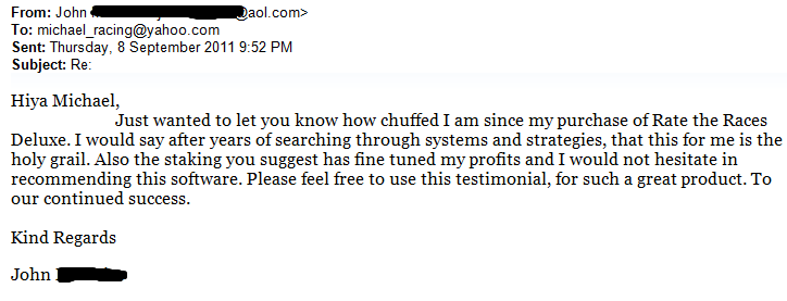If you don't accept this offer where will you be with your punting in a month from now? 2011-25© www.rate-the-races.com Steve Davidson © 2011-25 Refund Policy We, as a merchant, provide both products (goods) and services (information) to our customers. If merchandise or products are ordered through a Direct Mail advertisement or via the Internet, the guarantee, if any, is included in the mailing, promotion or service description. Our advertising will also include the terms and conditions for refunds on any books, publications and/or systems purchased. |